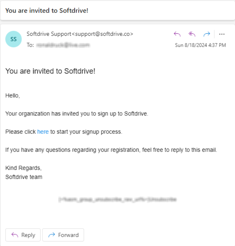 - Check your email inbox for a message titled “You are invited to Softdrive!”