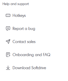 - Help: Where you can find options like "Report a bug", "Contact Sales", "Keyboard options", "Onboarding &FAQ" and more.