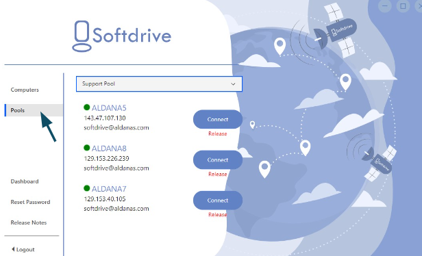 In order to access a computer in computer pools, go to the Pools tab in your softdrive app. This tab will show all the computers and whether they are available or not.
