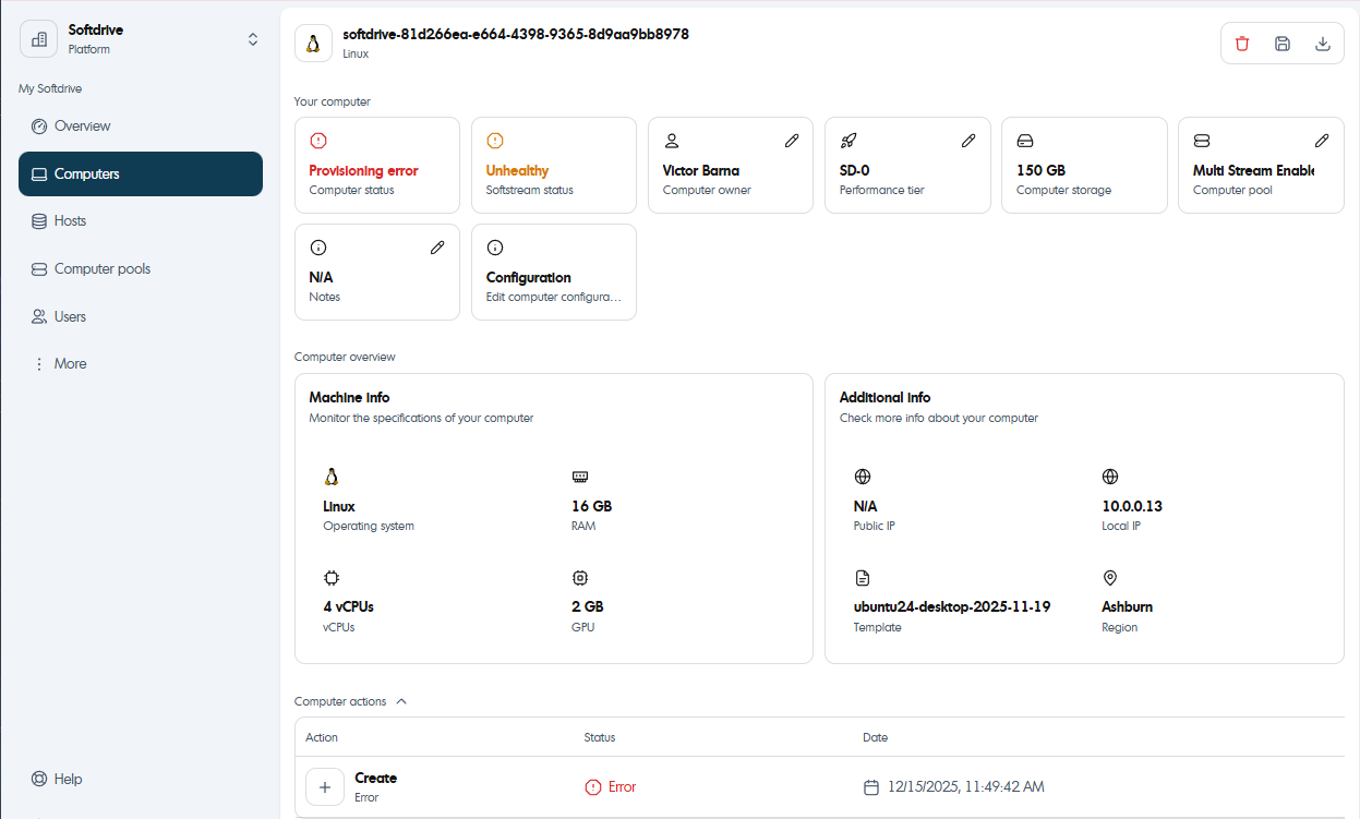 If your softdrive machine is not accessible or it is not able to be claimed, a process to troubleshoot is to "reassign" the softdrive machine, this process will refresh the reassignments and confirm it is available for the intended user.