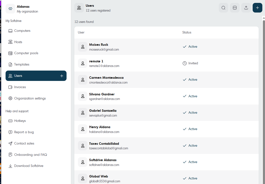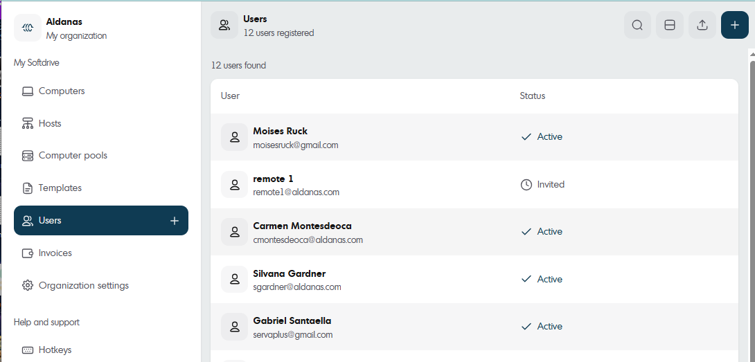 The Users section in Softdrive allows administrators to manage all users within their organization. From this menu, you can view existing users, invite new users, upload users in bulk, synchronize users from an identity provider, and delete users when necessary.