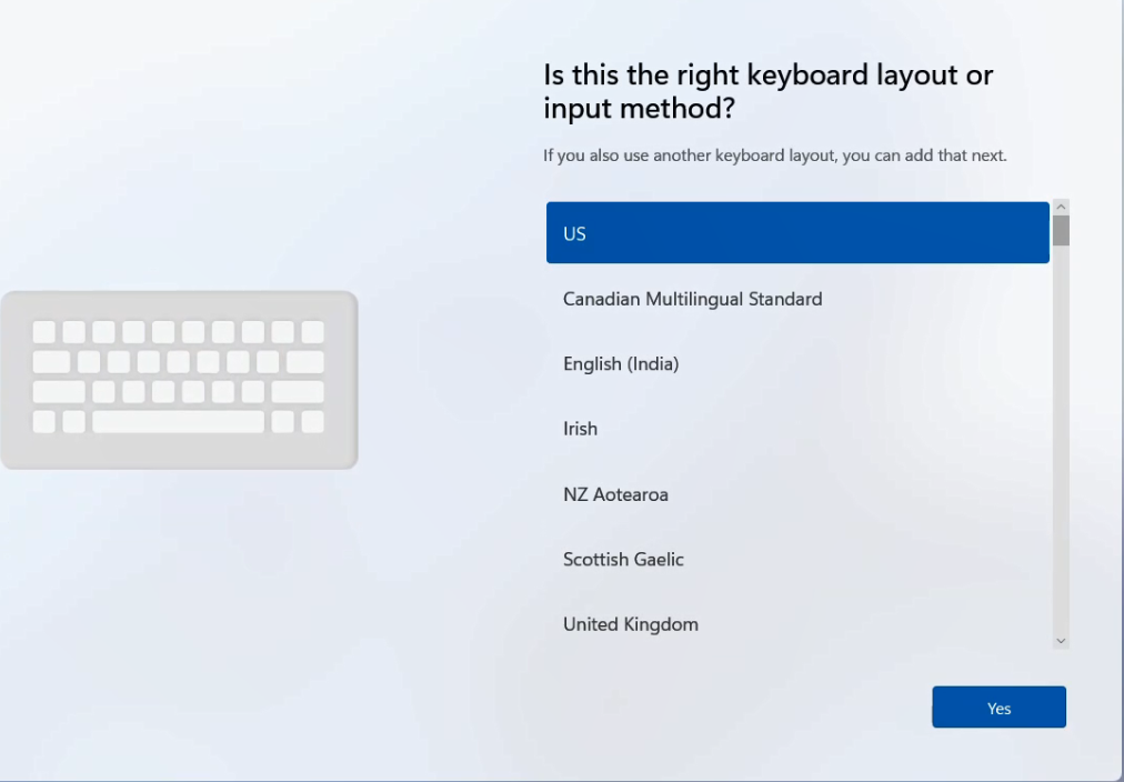Choose the desired configuration settings in country, keyboard, secondary keyboard.