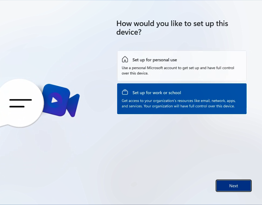 In this window choose the option that says "Set up for work or school"
