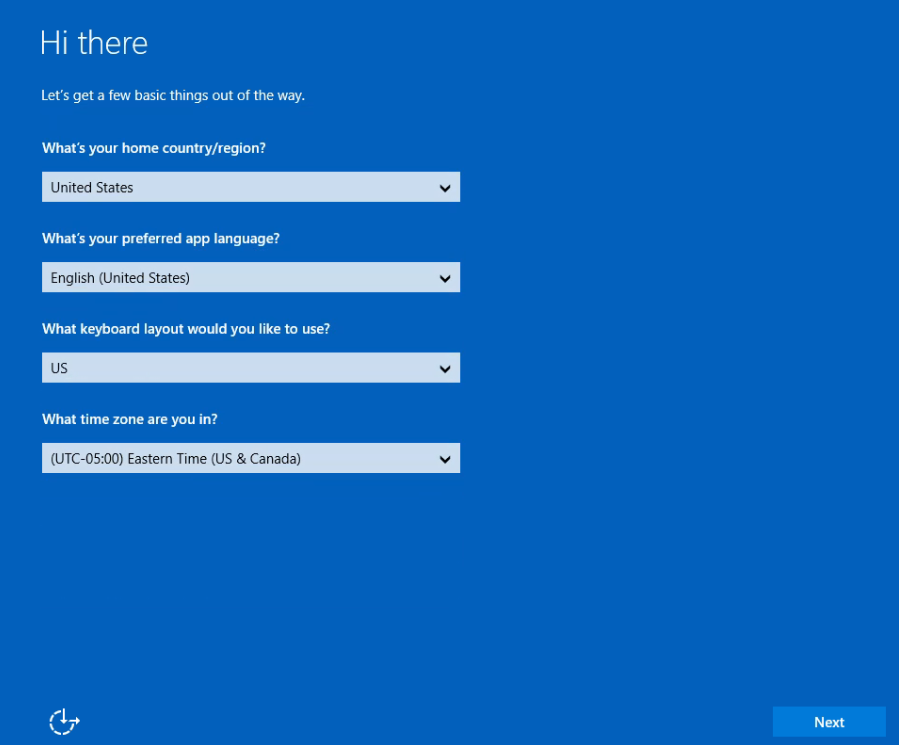 Choose the desired configuration settings such as country, keyboard, and secondary keyboard.