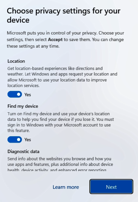 Enter the local admin username and password, set security questions, and accept privacy settings.