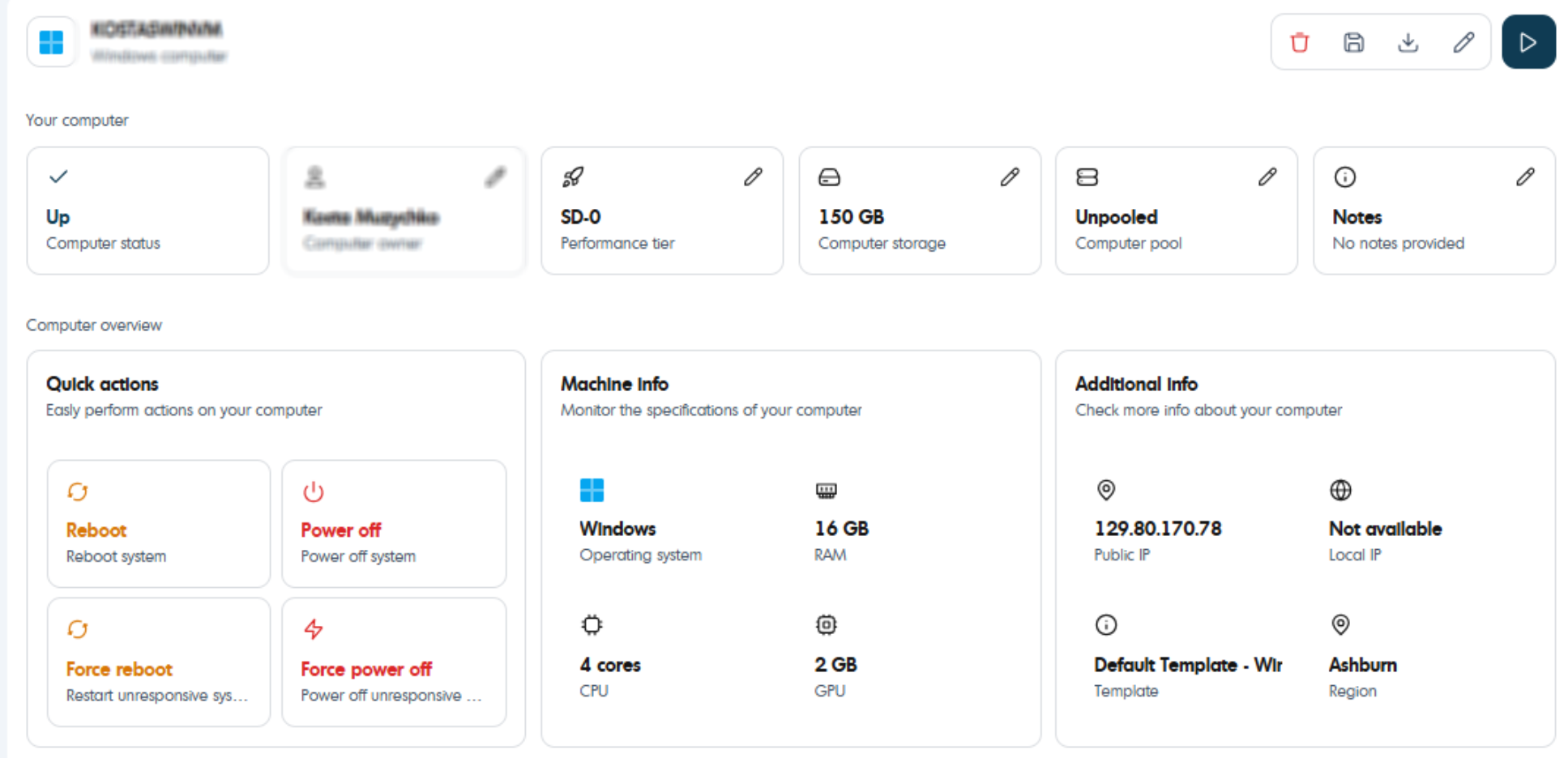 - Review machine information and available actions such as Connect, Delete, or Save as template