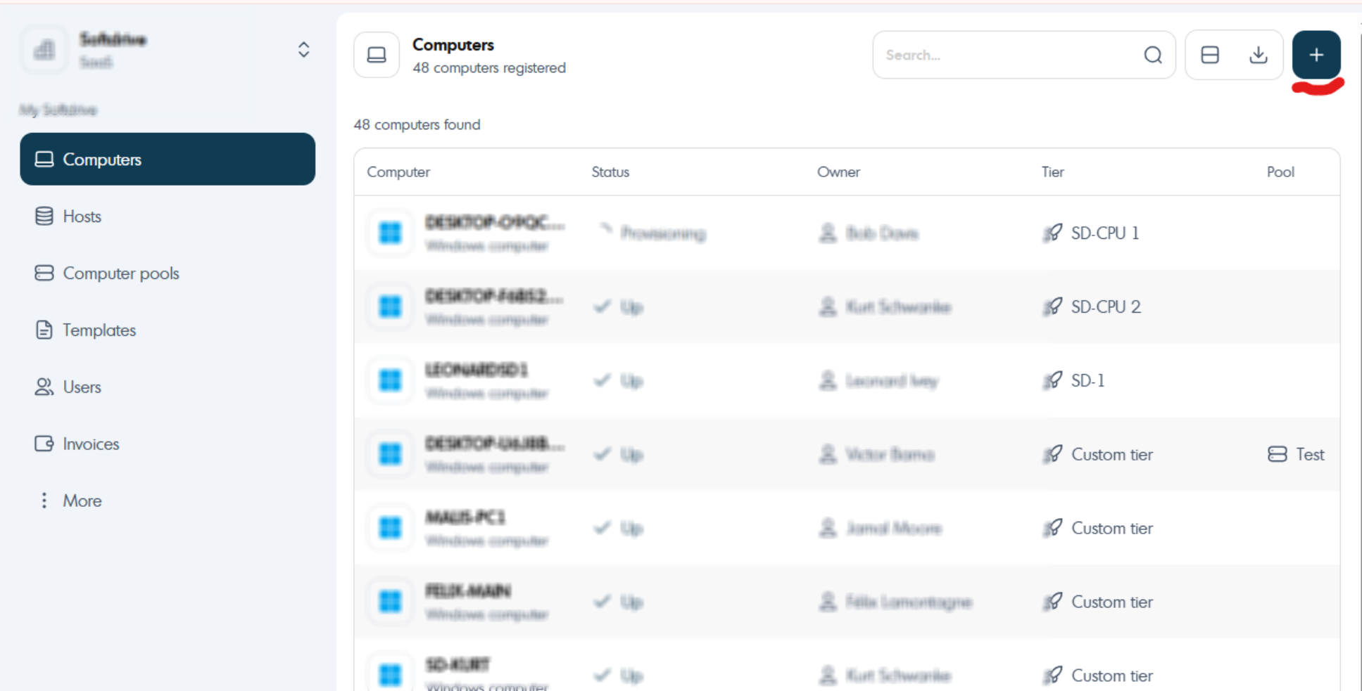 The Computers menu displays all virtual machines within your Softdrive organization. From this section, administrators can view, manage, create, and delete computers, as well as perform common troubleshooting and management actions.
