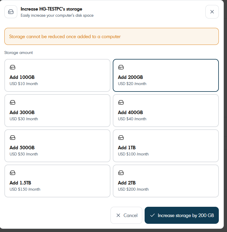 4. Select storage desired and hit Increase.