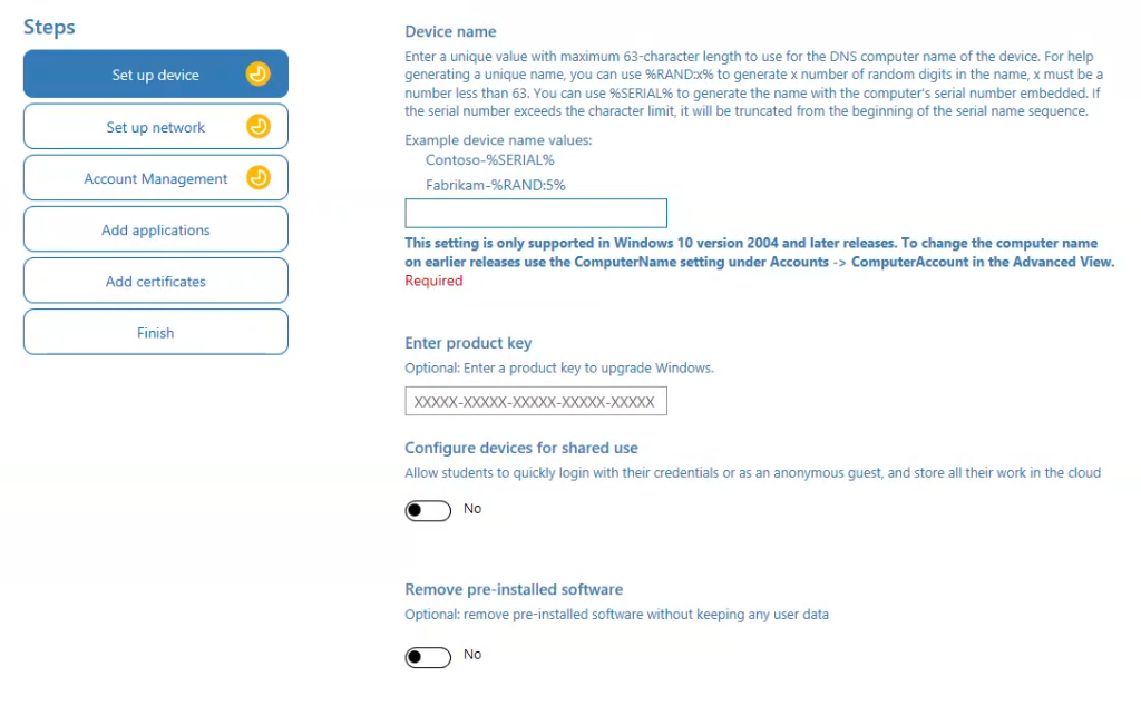 - Finish – Build the provisioning package