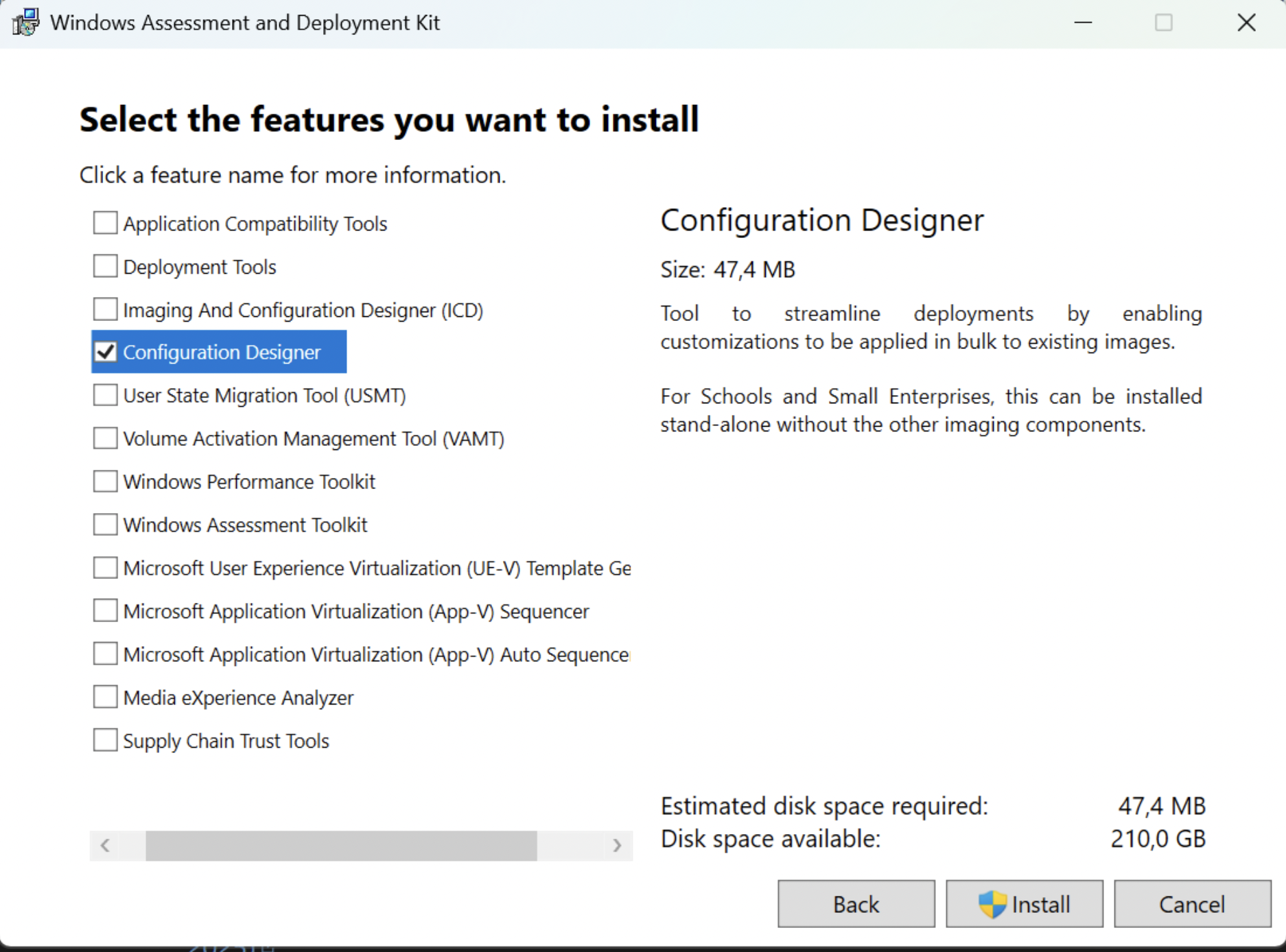 - On the “Select the features you want to install” screen select Windows Configuration Designer
